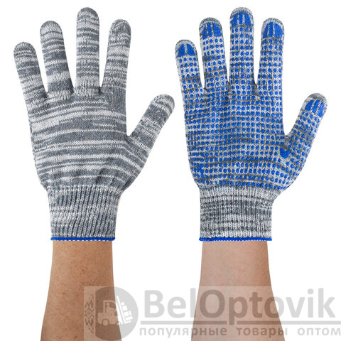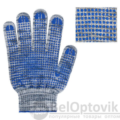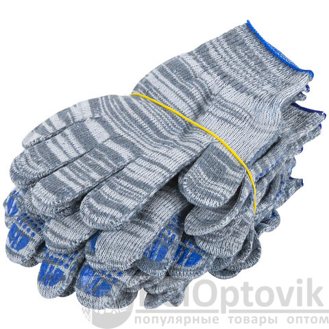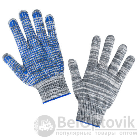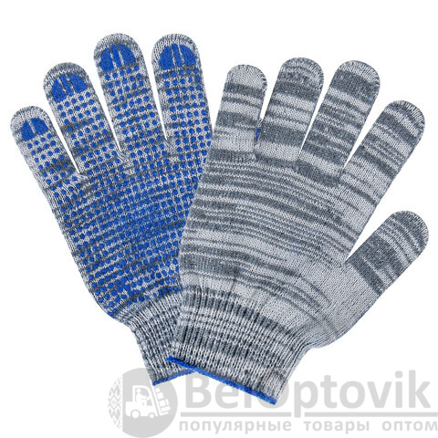 Изготовлены из хлопчатобумажной пряжи плотностью 133 текс с покрытием из поливинилхлорида с нанесением рисунка на внутреннюю сторону перчатки. Покрытие ПВХ помогает обеспечить плотный захват и предотвращает соскальзывание детали. Резинки на манжетах обеспечивают плотное прилегание перчатки к руке. Перчатки серого цвета имеют 10 класс вязки. Вес пары - 50-52 г. Поставляются в комплекте 100 штук в полиэтиленовой упаковке.