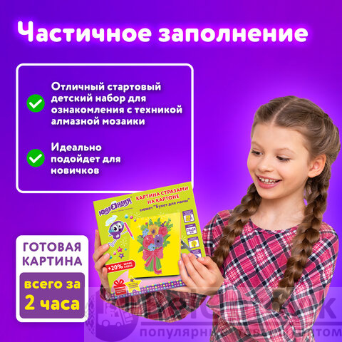 Алмазная мозаика - увлекательное и полезное хобби для детей, способствующее развитию мелкой моторики, усидчивости, аккуратности и внимательности. Выбирайте безопасное, доступное, развивающее творчество вместе с брендом ЮНЛАНДИЯ!