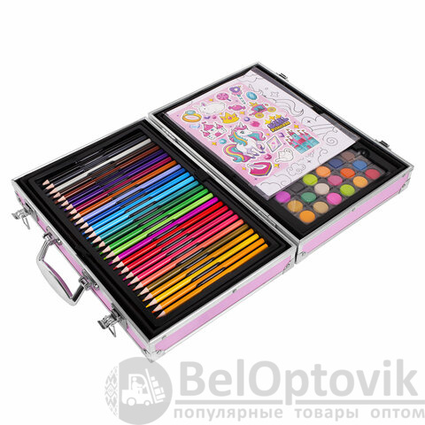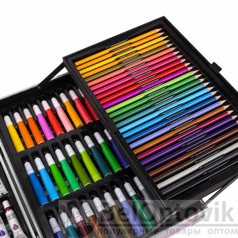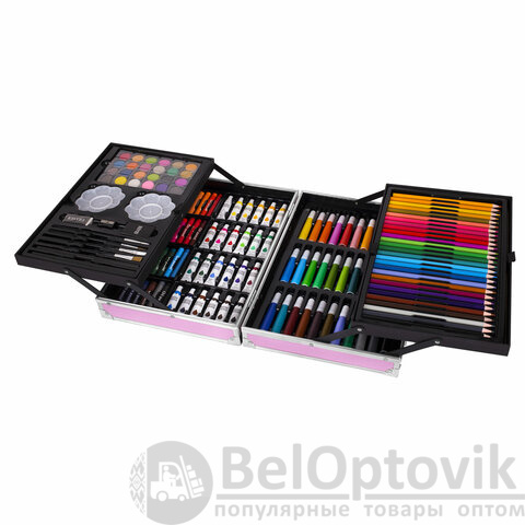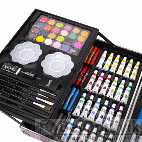 Набор представляет собой кейс с красочным дизайном и грамотно подобранным наполнением из 165 предметов. Кейс раскладывается как книга и имеет два яруса с подъемным механизмом. Каждый предмет надежно закреплен в ячейке. Прочный алюминиевый корпус гарантирует полную защиту внутреннего наполнения от повреждений. Набор надежно упакован в термоусадку и короб из гофрокартона. Углы кейса дополнительно защищены от повреждений при транспортировке. Набор удобно брать с собой в школу или в поездку.