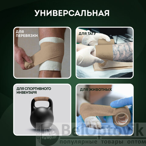 Фиксирующий нетканый бинт подходит для фиксации конечностей и катетеров у животных (кошек и собак). Подходит для камуфляжа и защиты туристических аксессуаров, используется для защиты от царапин и внешнего воздействия бинокля, оружия, ножа, фонаря. Может применяться для обмотки удочки, спортивного инвентаря (гантели, турник и т.д.), руля велосипеда – при этом лента выполняет противоскользящую функцию.