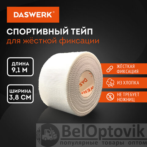 Спортивный тейп защитный неэластичный для жесткой фиксации, 9,1 м х 3,8 см, 1 рулон, белый, DASWERK, 680044