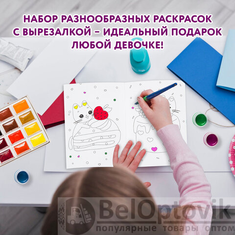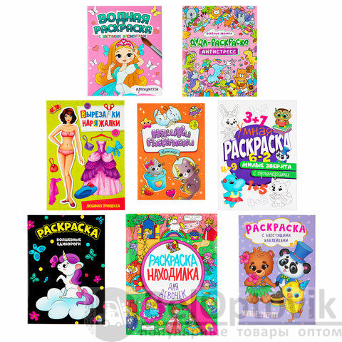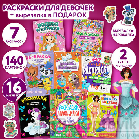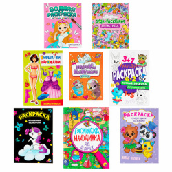 Комплект состоит из 7 раскрасок разных сюжетов с наклейками и без, а также 1 аппликация (вырезалка-наряжалка). Без возможности выбора сюжетов!