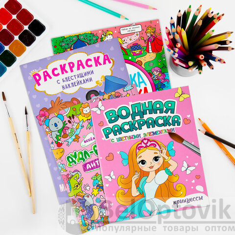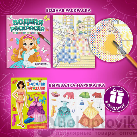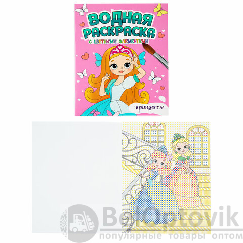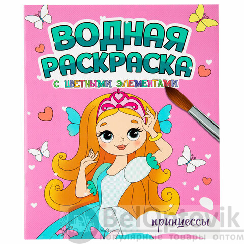 3. Водная раскраска с цветными элементами. "Принцессы", 198х248, 12 стр.
