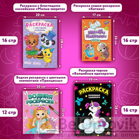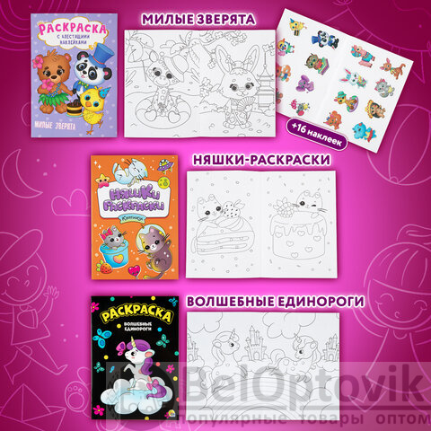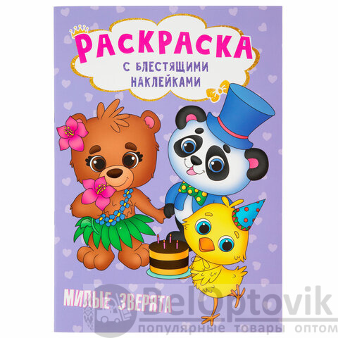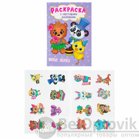 1. Раскраска с блестящими наклейками. "Милые зверята", 195х276 мм, 16 стр.