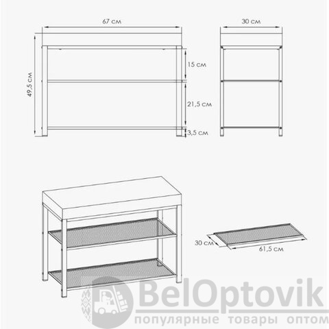Две полки, каждая из которых вмещает до 3 пар обуви и выдерживает нагрузку до 8 кг.