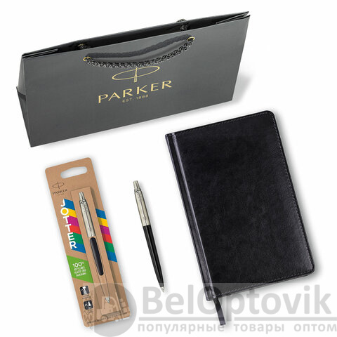 В набор входит ручка, ежедневник недатированный формата А5 черный, подарочный пакет с логотипом PARKER.