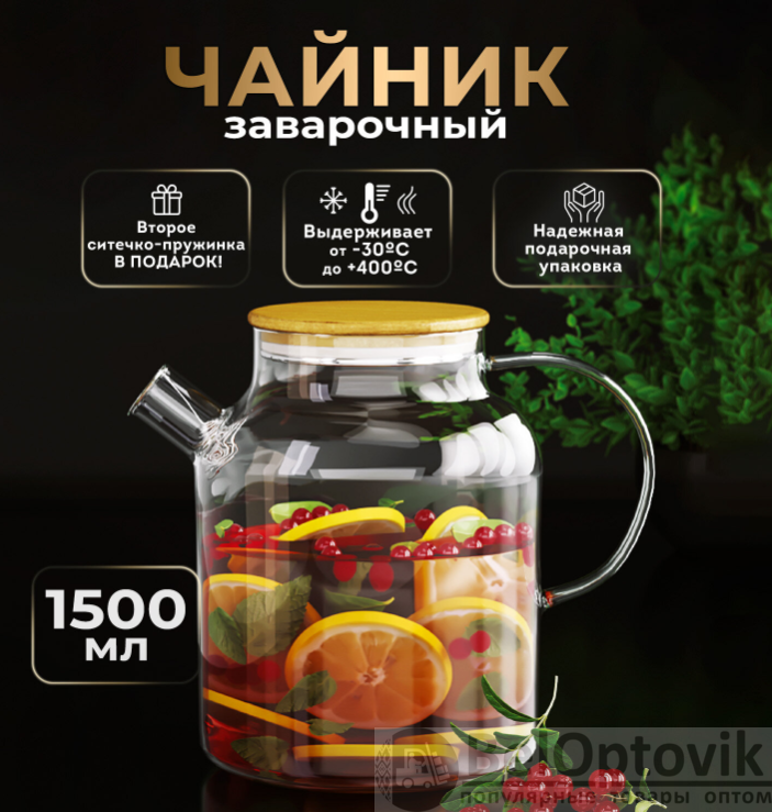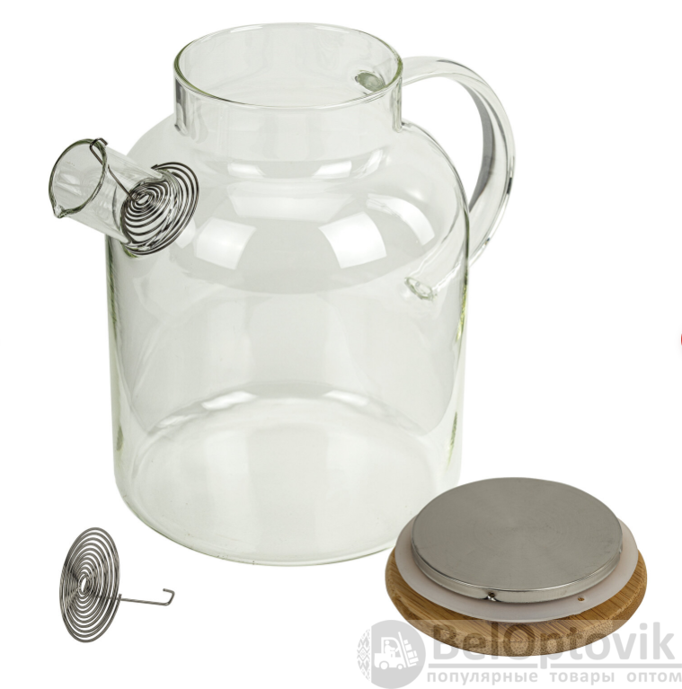 Купить Чайник заварочный 1500 мл., жаропрочное стекло, спиральное сито на нашем сайте можно ОПТОМ от 20 шт. или меньше, если Вы покупаете у нас и другие товары (сборный заказ)