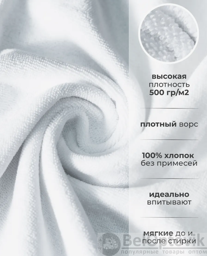 Полотенце махровое белое – это идеальное сочетание мягкости, впитываемости и долговечности. Изготовленное из 100% натурального хлопка плотностью 500 гр/м², оно подарит вам ощущение нежности и уюта после каждого душа или ванной.