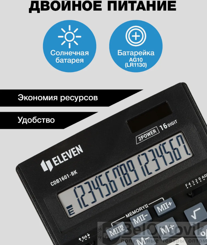 Важной особенностью CDB1601-BK является двойное питание. Он работает как от солнечной батареи, так и от батарейки типа AG10(LR1130), что позволяет вам использовать его в самых разных условиях. Кроме того, благодаря автоматическому отключению, прибор умеет экономить энергию, что увеличивает его срок службы. Приобретайте школьный калькулятор ELEVEN уже сегодня и наслаждайтесь простотой и эффективностью расчетов.
