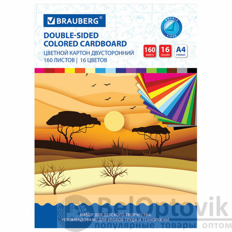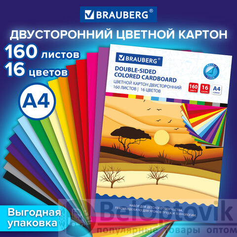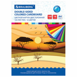 Картон цветной А4 ТОНИРОВАННЫЙ В МАССЕ, 160 листов, 16 цветов, 180 г/м2, BRAUBERG, 115090