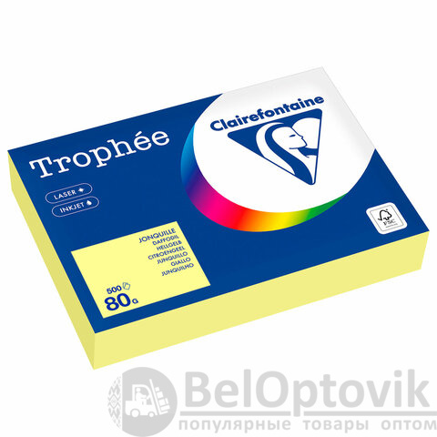 Бумага серии TROPHЕE от французского производителя CLAIREFONTAINE выпускается в широкой цветовой гамме. Упакована в пачку из 500 листов формата А4. В упаковке – бумага пастельного тона лимонно-желтого цвета. Листы бумаги плотностью 80 г/м2 подходят для офисной техники.