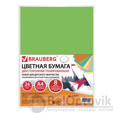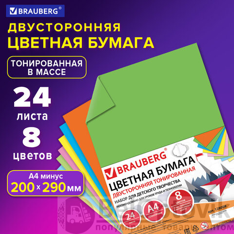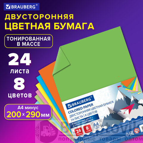 Цветная бумага А4 ТОНИРОВАННАЯ В МАССЕ, 24 листа 8 цветов (4 пастель + 4 интенсив), BRAUBERG, 200х290 мм, 128009