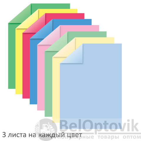 Двусторонняя цветная бумага окрашивается непосредственно в процессе изготовления и обладает плотностью 80 г/м2. Набор включает 24 листа размером 200х290 мм (чуть меньше, чем формат А4) в 8-ми цветах - 4 пастельных (приглушенных) + 4 интенсивных (насыщенных). Листы упакованы в полиэтиленовый пакет с липким краем, легко режутся и сгибаются.