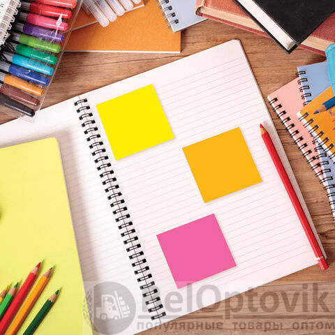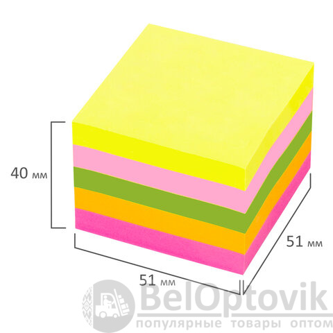 Стикеры 5 неоновых цветов (желтый, розовый, зелёный, оранжевый, малиновый) в форме куба 51х51 мм состоят из 400 листов. Плотность бумаги составляет 75 г/м2. Клейкий слой - 22 Н/м. Легко клеятся к любой поверхности. Не оставляют следов. Упакованы в полиэтиленовую пленку.