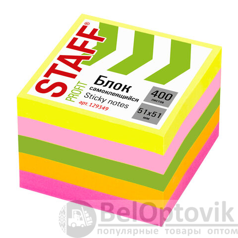 Блок самоклеящийся (стикеры) STAFF, НЕОНОВЫЙ, 51х51 мм, 400 листов, 5 цветов, 129349
