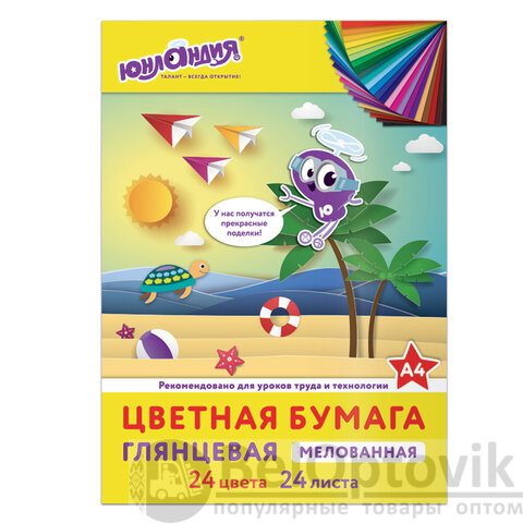 Цветная бумага, А4, мелованная (глянцевая), 24 листа 24 цвета, на скобе, ЮНЛАНДИЯ, 200х280 мм, "ЮНЛАНДИК НА МОРЕ", 129555