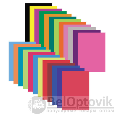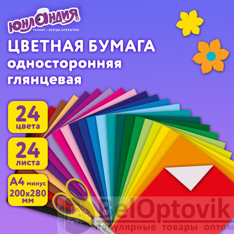 Набор односторонней цветной бумаги плотностью 65 г/м2 включает 24 листа формата А4 (24 различных цвета). Листы надежно скреплены скобами. Бумага легко режется и сгибается. Помогает развивать моторику, фантазию и пространственное мышление ребенка.
