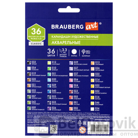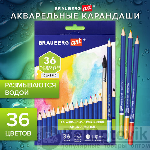 Карандаши художественные цветные акварельные BRAUBERG ART CLASSIC, 36 цветов, грифель 3,3 мм, 181531