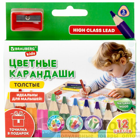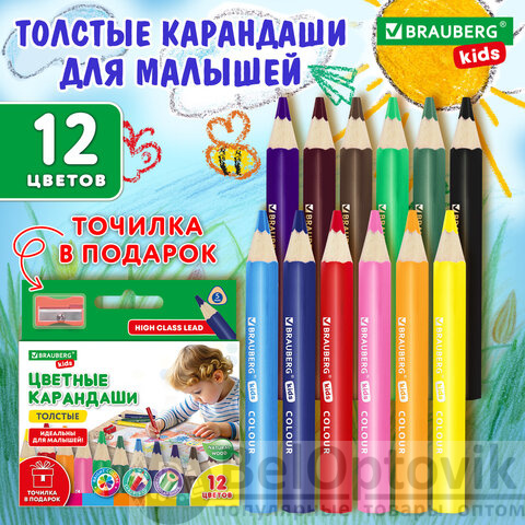 Карандаши цветные толстые для малышей 12 цветов + ТОЧИЛКА В ПОДАРОК! трехгранные, натуральное дерево BRAUBERG KIDS, 182058