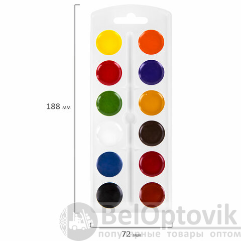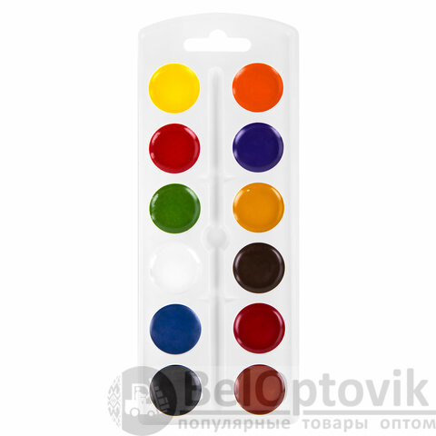 12 ярких насыщенных цветов отлично смешиваются между собой, позволяют создать множество оттенков и обеспечивают однородное окрашивание. Краски быстро высыхают и не портятся со временем. Безопасны для детей, нетоксичны. Выпускаются в картонной коробке с пластиковой подложкой, кюветами круглой формы и отделением для кисточки. Упаковка обладает компактными размерами и легким весом.