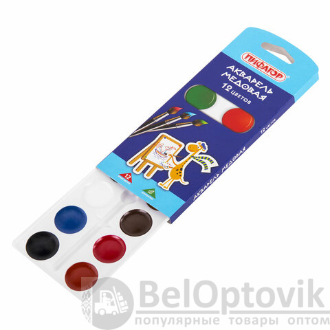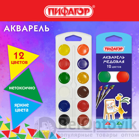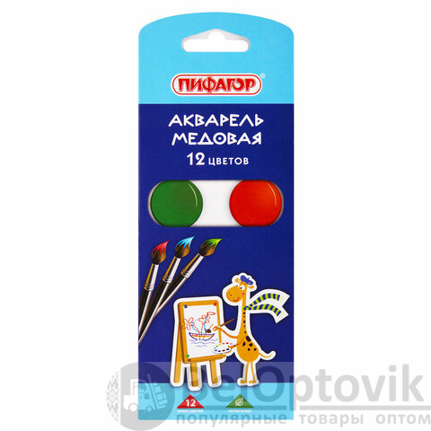 Краски акварельные ПИФАГОР "ЖИРАФ" на коррексе, 12 цветов, медовые, круглые кюветы, 192647