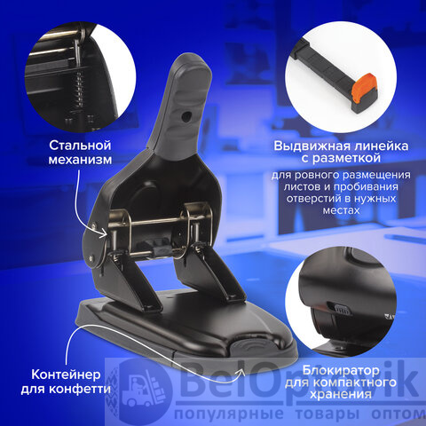 Способен пробить за один раз 65 л. бумаги. Стандартное количество пробиваемых отверстий – 2, диаметр каждого – 6 мм. Благодаря расстоянию между отверстиями в 8 см проколотые дыроколом листы могут храниться в папке идеально ровно и не мяться. Когда будет завершен отчетный период, они обычно сшиваются ниткой и снимаются с металлических колец. Метка центрирования поможет ровно разместить листы. Наличие ограничительной линейки позволяет пробить отверстия в нужном месте, что делает возможным сложить документы в папку ровной стопкой. Дырокол оснащен блокиратором для компактного хранения. Основная задача контейнера для конфетти состоит в сборе мусора, благодаря чему не будет постоянно загрязняться рабочее пространство. Средние размеры делового аксессуара помогут с легкостью разместить на рабочем столе, а классическое сочетание черного с серым цветом отлично впишется в любой интерьер.