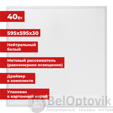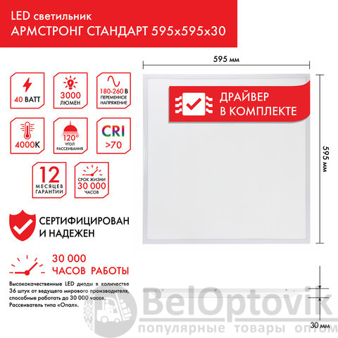 Светильник светодиодный с драйвером АРМСТРОНГ SONNEN СТАНДАРТ 4000 K, нейтральный белый, 595х595х30 мм, 40 Вт, матовый, 237154