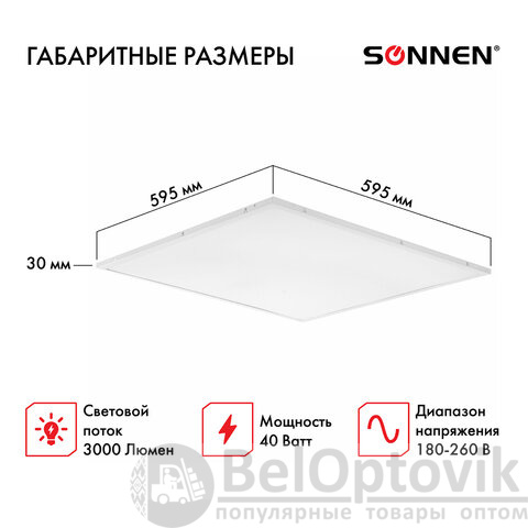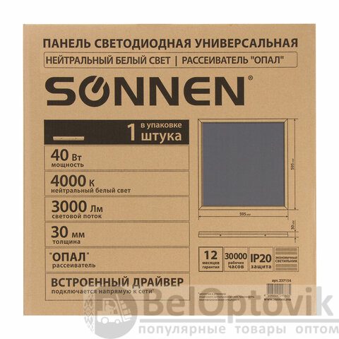 Прибор SONNEN освещает пространство со световым потоком, равным 3000 Лм, при цветовой температуре, составляющей 4000 К, благодаря чему подходит для обслуживания большого помещения. Рабочий ресурс диодов составляет 30000 часов. Его размеры составляют 595x595x30 мм.