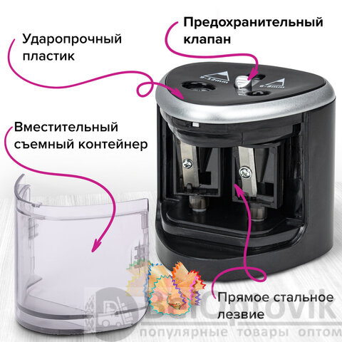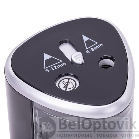 Стильный корпус точилки, выполненный из ударопрочного пластика, позволит ей стать интересной деталью любого интерьера, а прочное прямое лезвие осуществляет острую и быструю заточку любых деревянных и пластиковых карандашей. Подходит как для чернографитных, так и для цветных карандашей. Точилка имеет два отверстия для карандашей диаметром 6-8 мм и 9-12 мм, а также оснащена предохранительным клапаном. Помимо прочего, обладает противоскользящим основанием. Механизм приходит в движение при помощи электричества от 4 батареек АА (в комплект не входят). Затачивание начинается автоматически после помещения карандаша внутрь точилки, и через несколько секунд карандаш идеально заточен и готов к использованию.