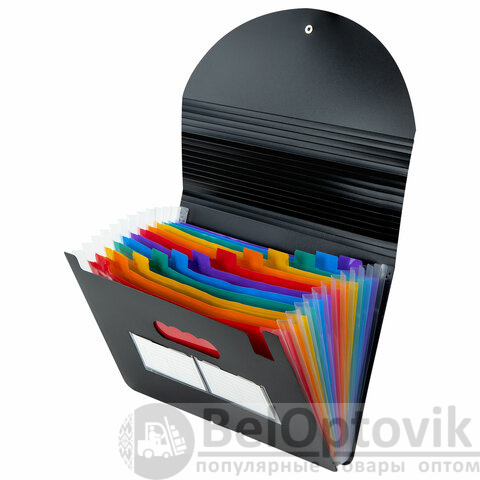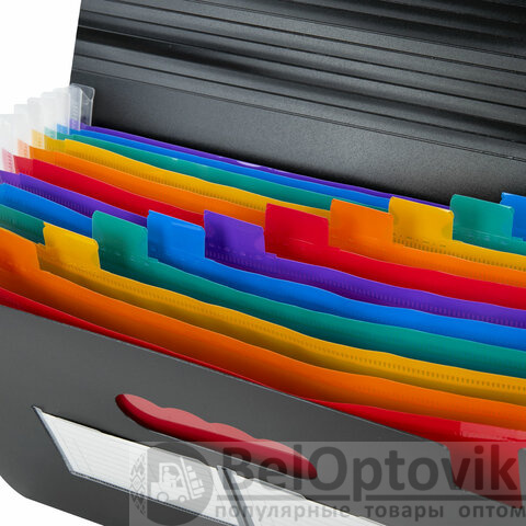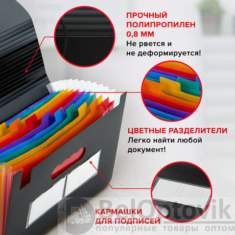 Изготовлена из качественного пластика толщиной 0,8 мм с фактурой под песок. Содержит 13 цветных отделений, которые позволяют структурировать большое количество документов. Для удобства поиска нужного документа разделители снабжены индексными ярлыками. Удобный замок позволяет быстро закрывать и открывать папку, не позволяя содержимому выпасть, и защищая от влаги, пыли и прочих механических повреждений. На лицевой стороне имеются 2 кармана для визиток. Папка представлена в солидном черном цвете.