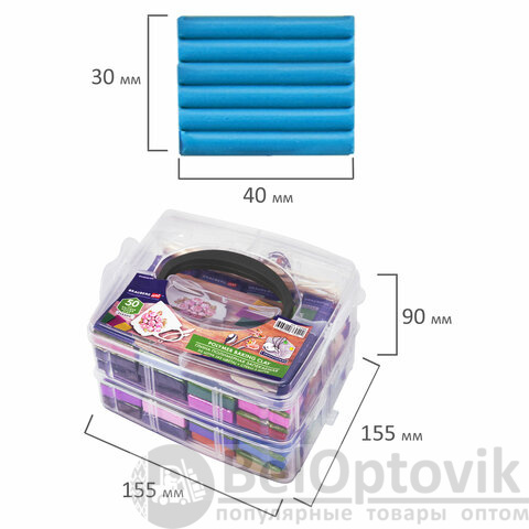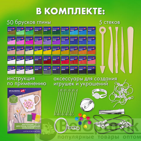 Набор включает в себя 50 брусков (по 20 г) полимерной глины, 5 пластиковых стеков, комплект аксессуаров для создания поделок и инструкцию по эксплуатации. В наборе 42 ярких и насыщенных цвета (дополнительные бруски белого - 5 шт., черного - 3 шт., телесного - 1 шт.). Глина не пачкает и не сушит руки, легко смывается с рук и рабочей поверхности водой или влажными салфетками.