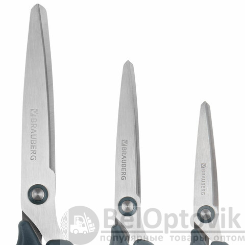 Набор универсальных ножниц BRAUBERG. Эти ножницы идеально подходят для резки бумаги, картона и других материалов, что делает их незаменимыми как в офисе, так и дома.