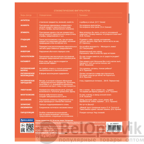 Тетрадь по литературе формата А5 (165х205 мм) содержит 36 листов, изготовленных из высококачественной офсетной бумаги плотностью 60 г/м2, 100% белизны. Листы соединены скобами. Блок разлинован в линию с красными полями. Обложка выполнена из мелованной бумаги плотностью 170 г/м2. На обратной стороне обложки размещена основная справочная информация по школьному предмету.