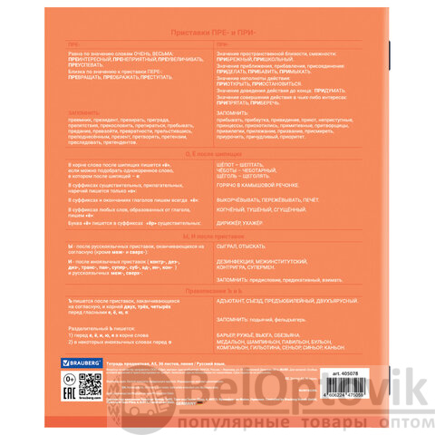Тетрадь по русскому языку формата А5 (165х205 мм) содержит 36 листов, изготовленных из высококачественной офсетной бумаги плотностью 60 г/м2, 100% белизны. Листы соединены скобами. Блок разлинован в линию с красными полями. Обложка выполнена из мелованной бумаги плотностью 170 г/м2. На обратной стороне обложки размещена основная справочная информация по школьному предмету.