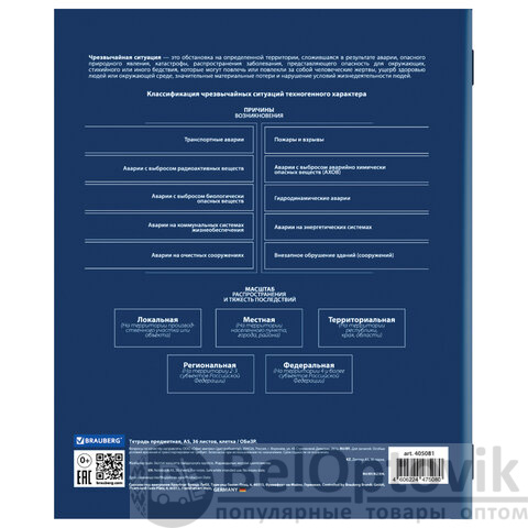 Тетрадь по ОБиЗР формата А5 (165х205 мм) содержит 36 листов, изготовленных из высококачественной офсетной бумаги плотностью 60 г/м2, 100% белизны. Листы соединены скобами. Блок разлинован в клетку с красными полями. Обложка выполнена из мелованной бумаги плотностью 170 г/м2. На обратной стороне обложки размещена основная справочная информация по школьному предмету.
