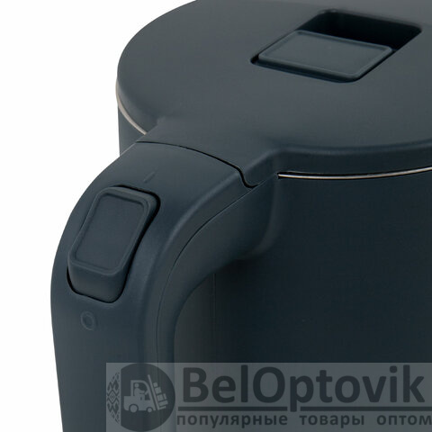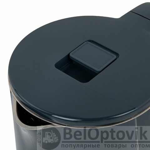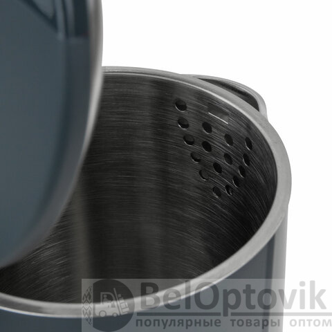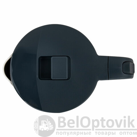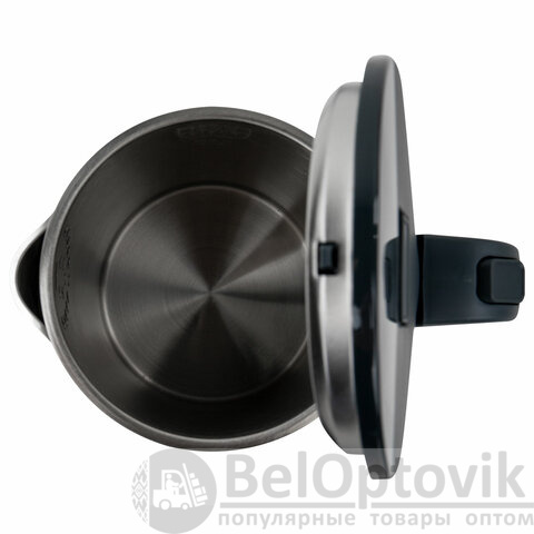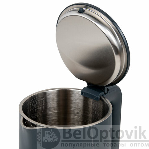 На крышке чайника находится кнопка открывания, что делает его удобным в эксплуатации. Чайник имеет адиабатный корпус: внутренняя колба сделана из нержавеющей стали, внешнее покрытие – из термостойкого пластика. Благодаря такому корпусу чайник дольше сохраняет тепло.