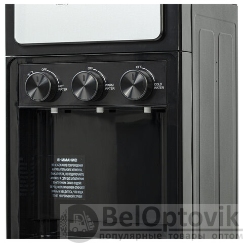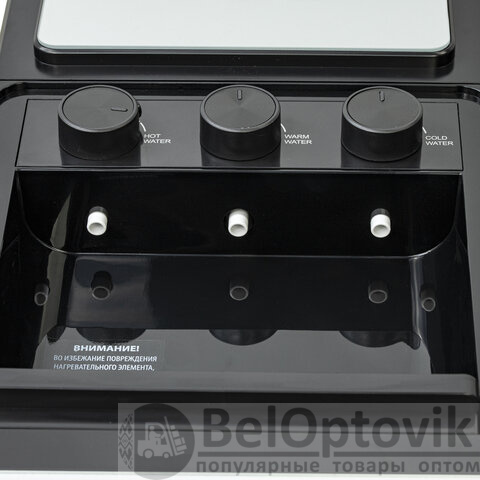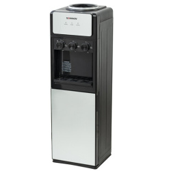 Он прост в использовании, имеет три поворотных крана для подачи горячей, холодной, а также воды комнатной температуры. Вода нагревается с помощью ТЭНа мощностью 500 Вт, что позволяет достичь температуры 90 °С за считанные минуты. Модуль электронного охлаждения мощностью 70 Вт обеспечивает поддержание температуры холодной воды на уровне 15 °С. Также изделие оборудовано функцией "Защита от детей" на кране подачи горячей воды. Кулер оснащен LED-индикаторами на стеклянной панели, которые оповещают о нагреве, охлаждении и работе устройства.