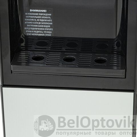 Устройство изготовлено из прочных и безопасных материалов. Корпус выполнен из высококачественного пластика с металлическими сторонами по бокам и стеклянной панелью на передней стороне устройства. Кулер с верхней загрузкой бутыли оснащен шкафчиком в нижней части корпуса.
