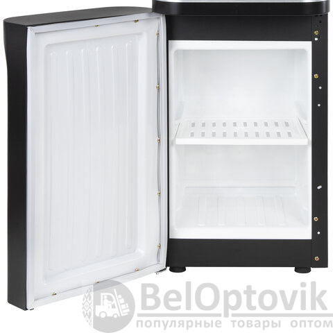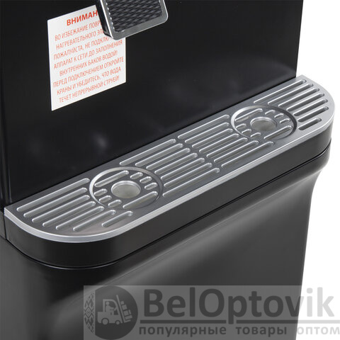 Устройство изготовлено из прочных и безопасных материалов. Корпус выполнен из высококачественного пластика, боковые части выполнены из металла. Кулер с верхней загрузкой бутыли оснащен шкафчиком в нижней части корпуса, который можно использовать для хранения посуды, салфеток и других нужных вещей.