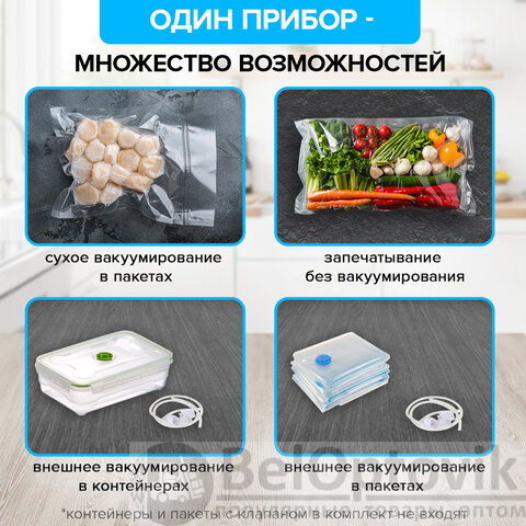 С помощью вакуумного упаковщика SONNEN VS-903 можно готовить по технологии су-вид, что позволит сохранить сок и насыщенный аромат продуктов. Устройство обладает функцией внешнего вакуумирования как контейнеров, так и пакетов. Для этого в комплекте есть трубка, с помощью которой можно удалить из контейнера воздух.