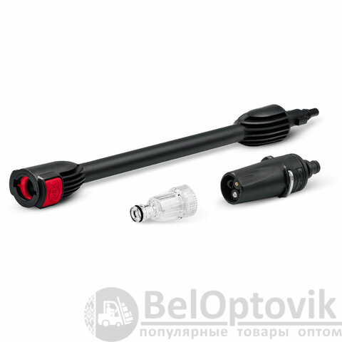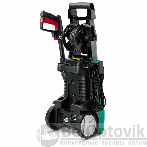 - Комплектация: барабан для шланга, насадка-пистолет, пеногенератор, струйная трубка, фильтр для воды, шланг высокого давления