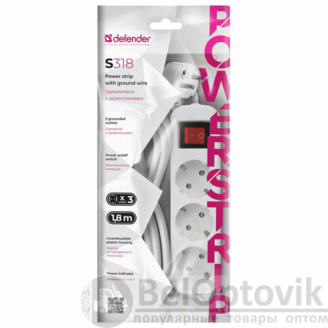 Удлинитель сетевой DEFENDER S318, 3 розетки c заземлением, выключатель, 10А, длина 1,8 м, белый, 99233
