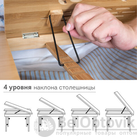 Телескопические ножки позволяют регулировать высоту столика от 20 до 27 см. Регулируемую часть столешницы можно установить под необходимым для комфортной работы наклоном. Благодаря столику для ноутбука снижается нагрузка на мышцы спины и шеи. Наличие на фиксированной части столешницы специального углубления даёт возможность разместить на ней стакан или кружку.