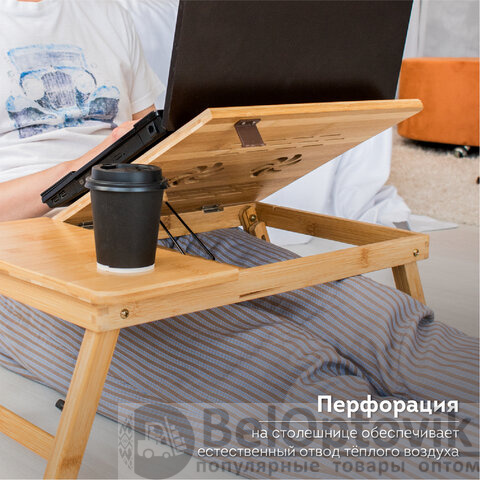 Специальные отверстия на регулируемой части столешницы осуществляют отвод теплого воздуха от ноутбука/планшета. Вес столика – 2,25 кг.