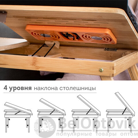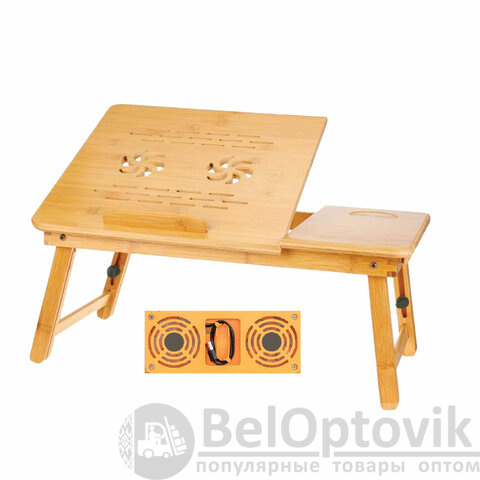 Специальные отверстия на регулируемой части столешницы осуществляют отвод теплого воздуха от ноутбука/планшета, а 2 USB-вентилятора обеспечат охлаждение ноутбука и предотвратят его перегрев. Вес столика – 1,95 кг.