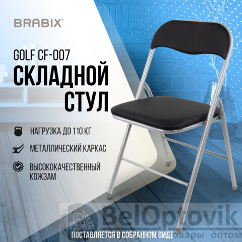 Практичная и удобная модель складного стула BRABIX "Golf CF-007" прекрасно подойдет для оснащения офисных учреждений, поликлиник, мест ожидания, холлов, учебных заведений, конференц-залов, административных помещений, общежитий, гостиниц, дворцов спорта.