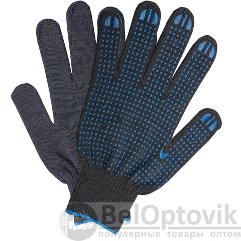 Изготовлены из хлопчатобумажной пряжи плотностью 116 текс с покрытием из поливинилхлорида с нанесением рисунка на внутреннюю сторону перчатки. Покрытие ПВХ помогает обеспечить плотный захват и предотвращает соскальзывание детали. Резинки на манжетах обеспечивают плотное прилегание перчатки к руке. Перчатки черного цвета имеют 10 класс вязки. Вес пары - 40-42 г. Поставляются в комплекте 5 штук в полиэтиленовой упаковке.