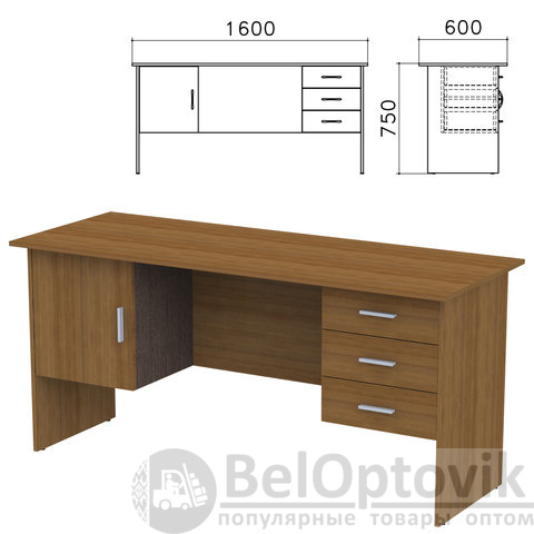 Стол письменный предназначен для эксплуатации в офисах, образовательных учреждениях, а также домашних условиях. Оборудован подвесными тумбами с 3 ящиками и дверью. На опоры установлены пластиковые нерегулируемые наконечники.