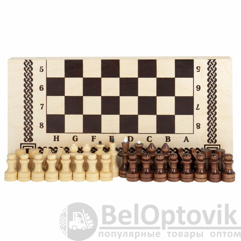 Шахматные фигуры из хвойных и лиственных пород дерева (32 штуки), защитное лаковое покрытие.