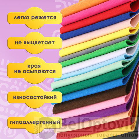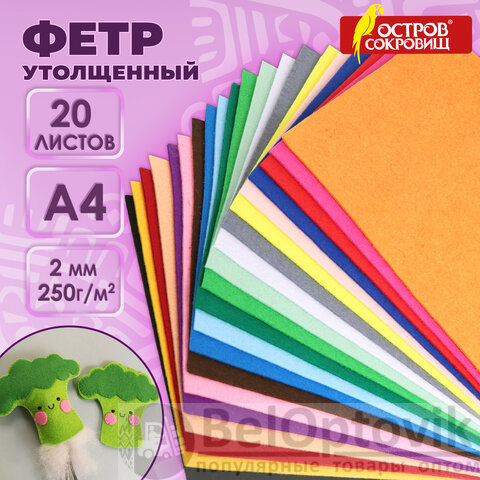 Фетр утолщенный А4, 2 мм, 20 листов, 20 цветов, плотность 250 г/м2, ОСТРОВ СОКРОВИЩ, 665475